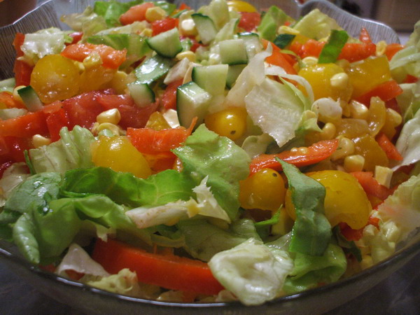 A salátát fejes salátából, paprikából, uborkából, vöröshagymából és finom kerti sárgaparadicsomból, és piros paradicsomból készítettem. Nyakon öntöttem egy kis extra szűz olívaolajjal, és tálaltam a fasírozott mellé.
