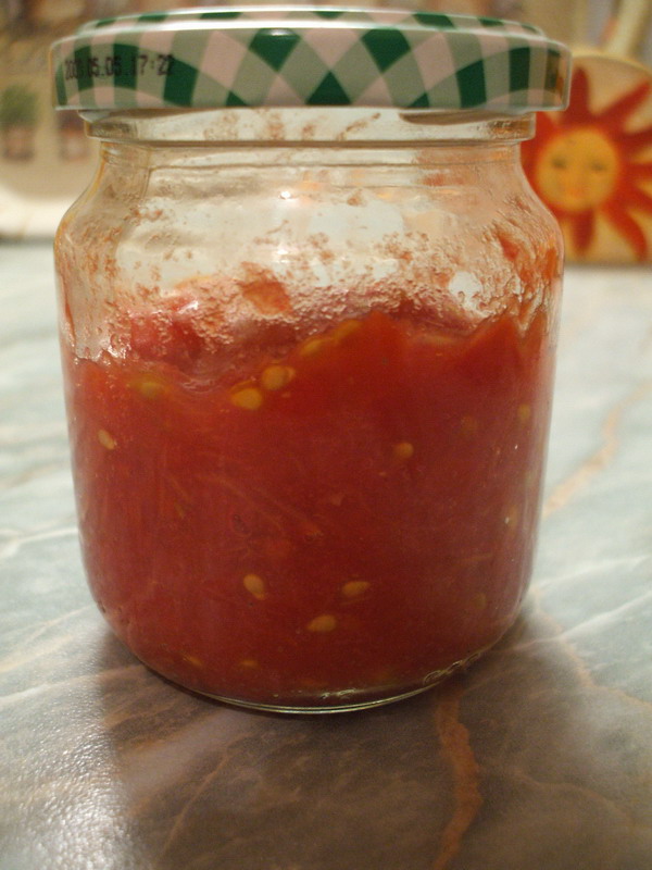 A megmaradt paradicsom húst, héjat, magokkal együtt, pedig beletöltöttem egy kis üvegbe és megsóztam Parajdi sóval. Elkészült a természetes ételízesítőm. Így lehet tárolni, bár nálunk más nap elfogyott, de nagyon finom volt!